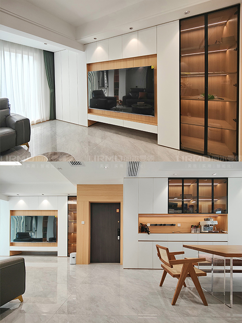 電視背景墻采用整面墻做儲(chǔ)物柜設(shè)計(jì),