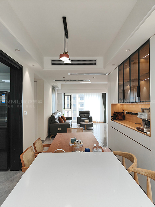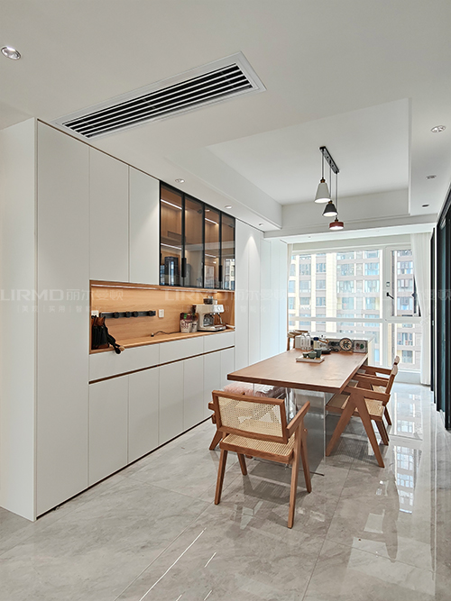 餐廳與生活陽(yáng)臺(tái)打通,餐邊柜+陽(yáng)臺(tái)柜融為一體,