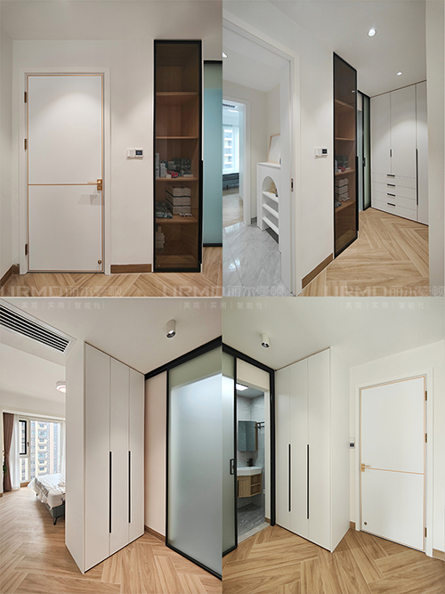 讓整個(gè)睡眠區(qū)舒適愜意。門邊做內(nèi)嵌玻璃柜,合理利用空間收納生活必需品