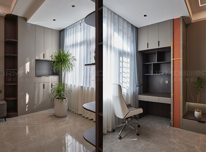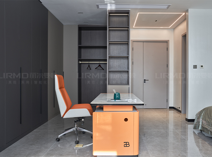 開(kāi)放式書(shū)桌選用橙色椅子點(diǎn)綴,在視覺(jué)上體現(xiàn)了整個(gè)空間的層次感。