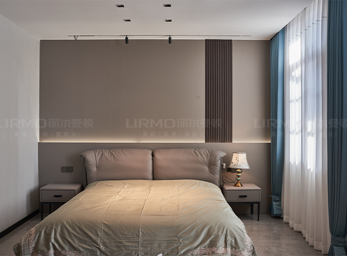床頭背景墻選用膚感格柵,吊頂無(wú)主燈設(shè)計(jì),