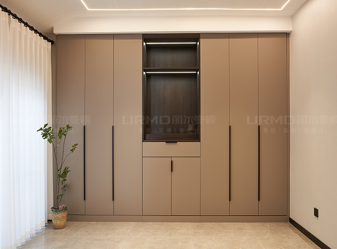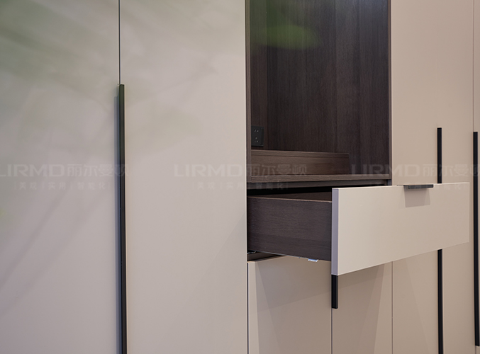 柜門選用膚感PET一門到頂設(shè)計(jì),搭配開(kāi)放格+抽屜柜