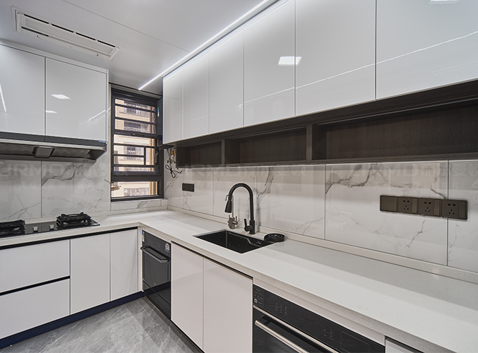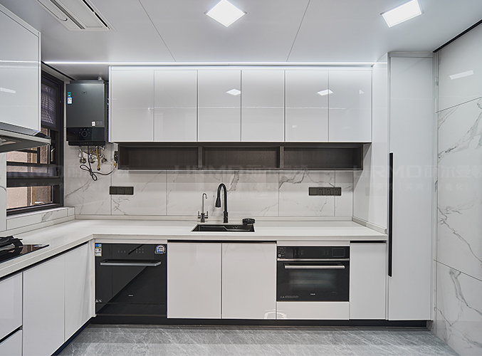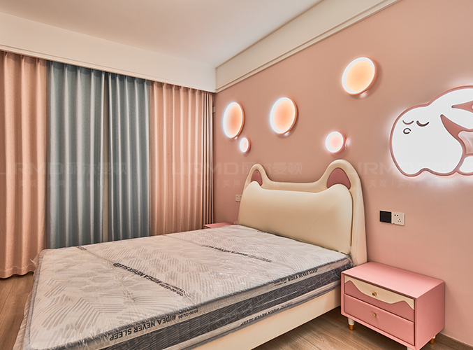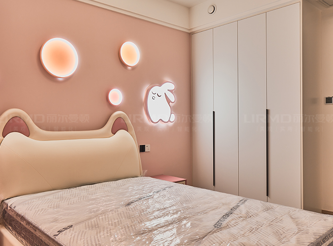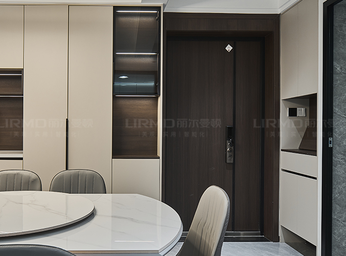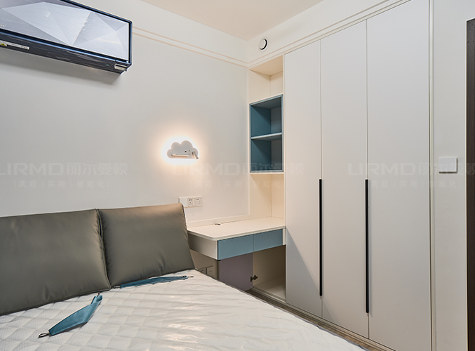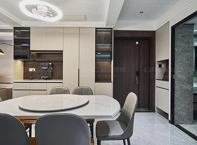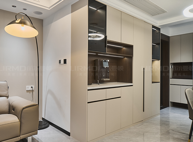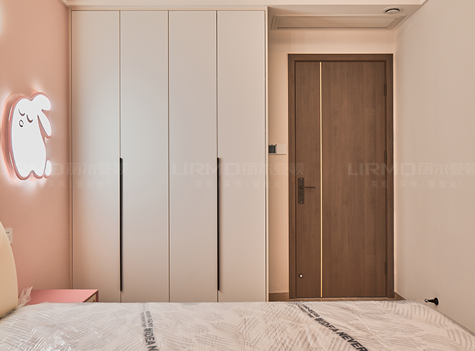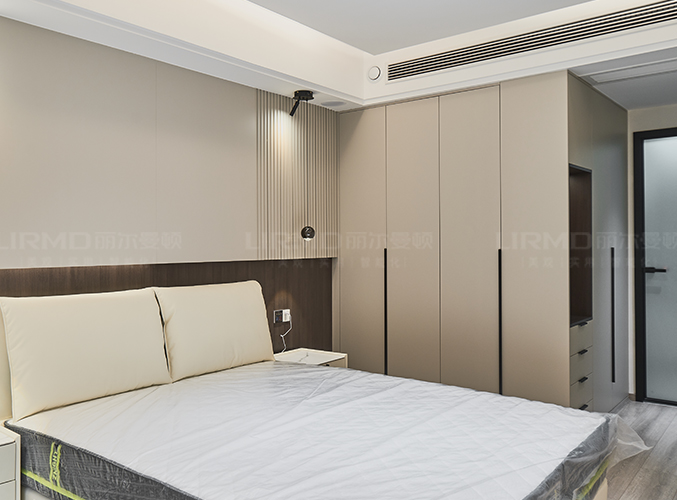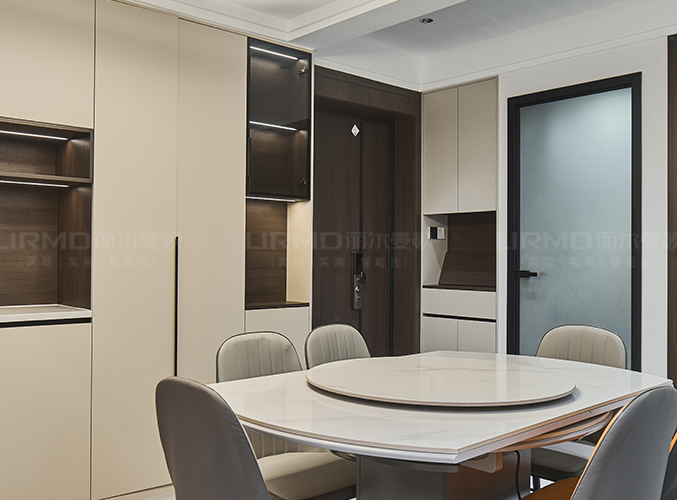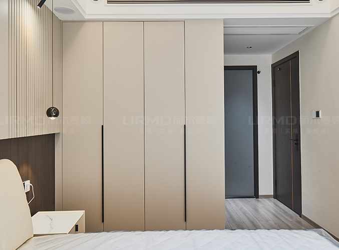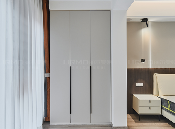 柜子一門(mén)到頂設(shè)計(jì),實(shí)木柜體搭配PET膚感柜門(mén),整體風(fēng)格與軟裝更加統(tǒng)一。