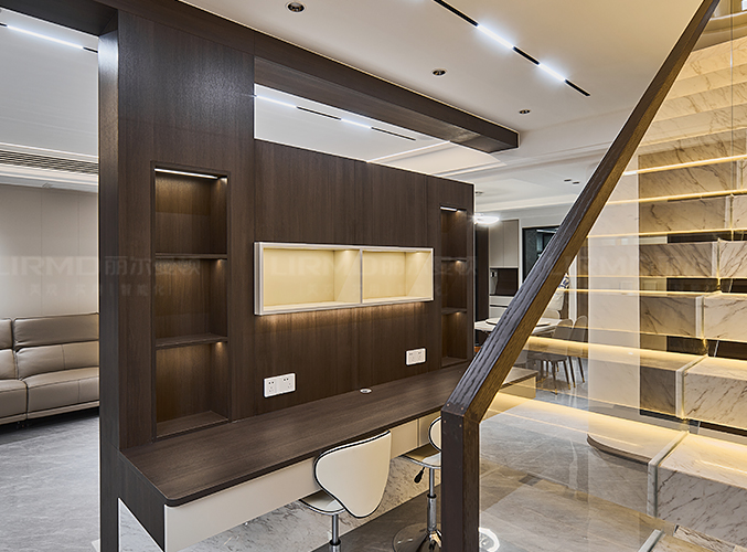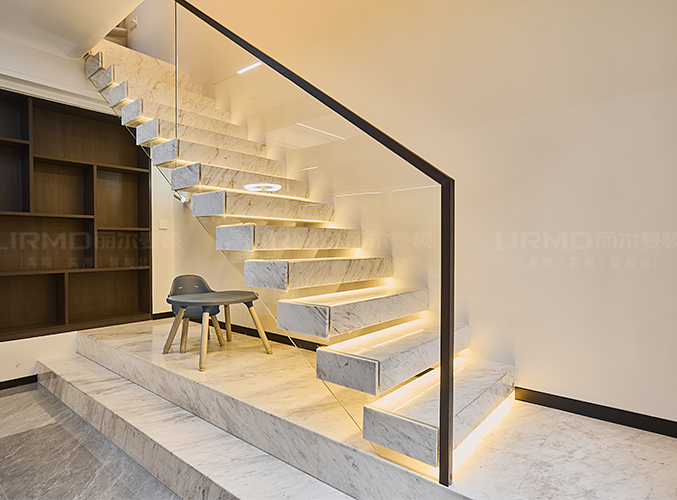 單邊懸浮樓梯,隱藏?zé)魩г黾訉哟胃?,在視覺(jué)上起到了懸浮效果,搭配玻璃護(hù)欄,