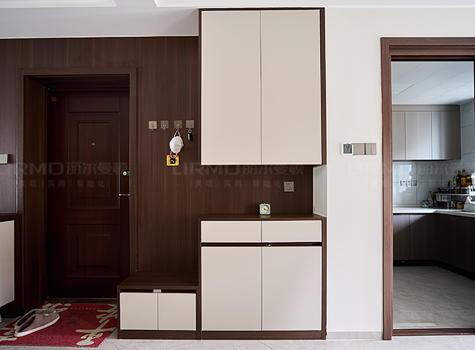 實木柜體搭配PET膚感柜門,,深色柜門與紅色內(nèi)嵌的碰撞,顯高端,側(cè)邊換鞋凳的位置讓你換鞋