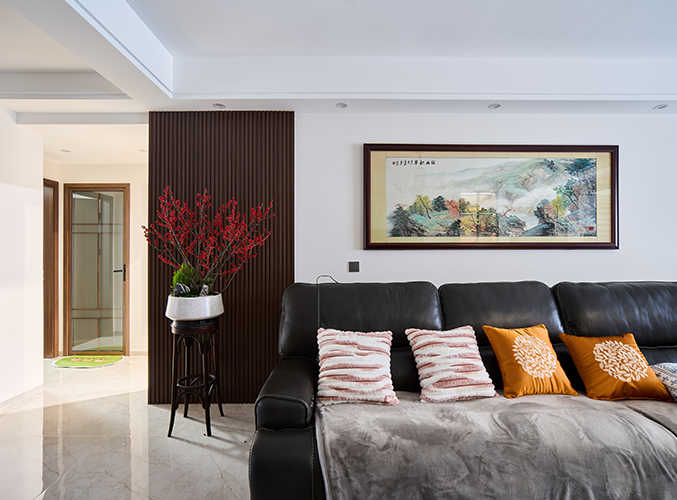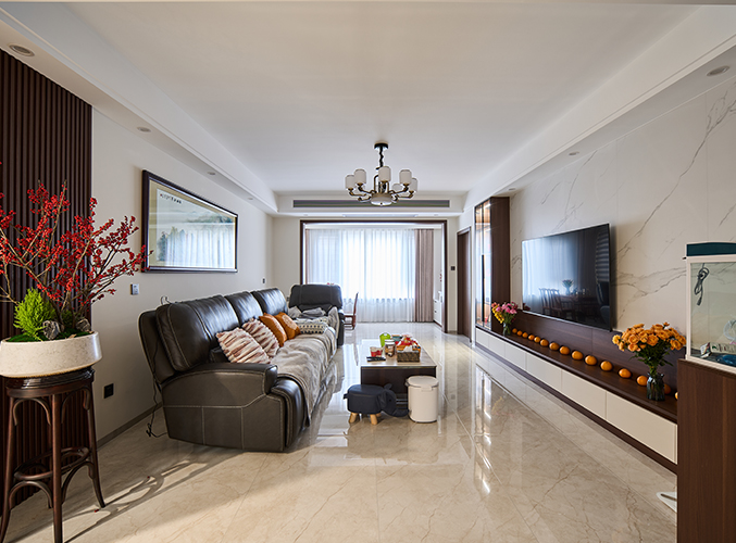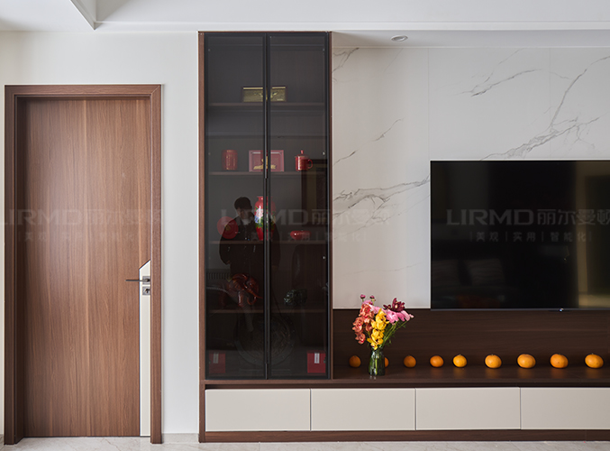 整屋通鋪瓷磚,盡顯大氣,電視背景墻采用整面墻設(shè)計,整體效果不顯沉悶,左側(cè)玻璃展示柜柜門