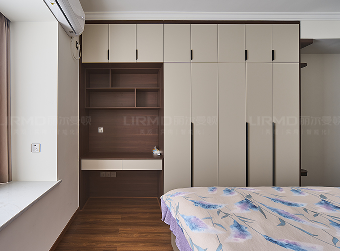 衣柜書桌一體化設(shè)計,一整排柜子視覺效果美觀且大氣,左側(cè)定制書桌設(shè)計,學(xué)習(xí)辦公兩不誤,