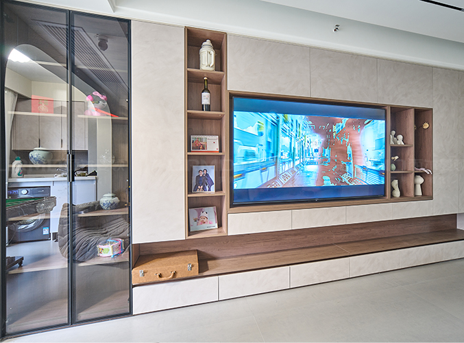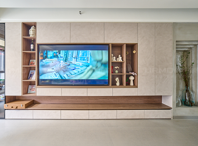 整屋通鋪瓷磚,盡顯大氣,電視背景墻設(shè)計(jì)幾盒壁龕放置擺件,與嵌入式電視柜融為一體,