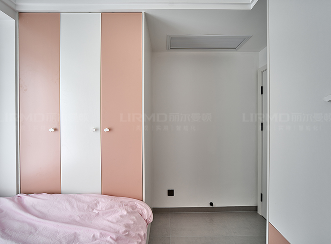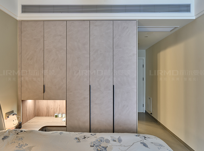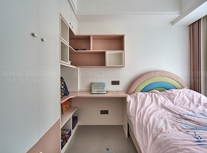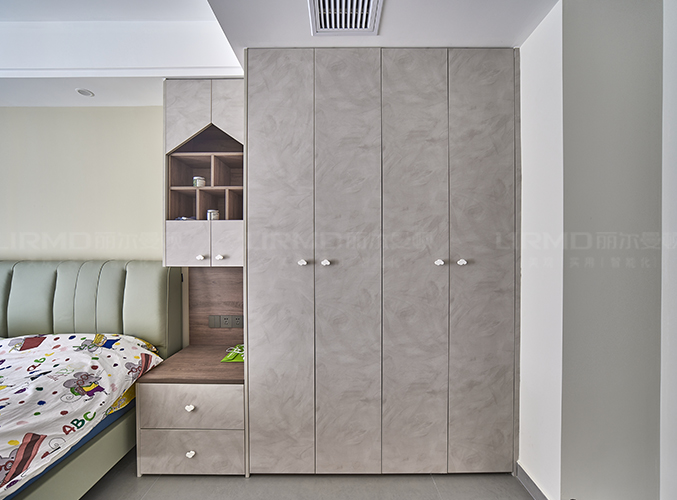 采用衣柜書桌一體設(shè)計(jì),既能儲(chǔ)物又能學(xué)習(xí)。