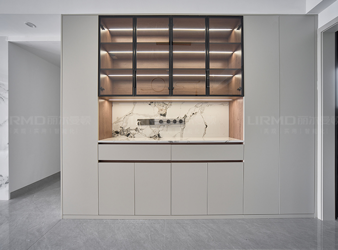 陽臺與客廳取消隔斷,空間更通透,柜門做圓形鏤空造型,氛圍拉滿。