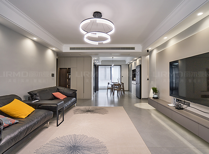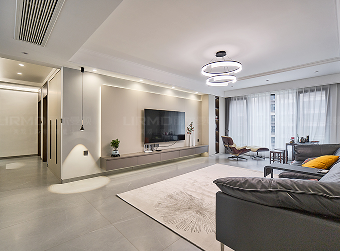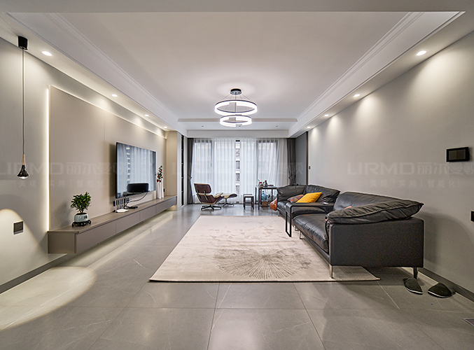 吊燈設(shè)計,增強照明實用性的同時又增貼了空間藝術(shù)感,灰色系色調(diào)搭配溫暖的燈光