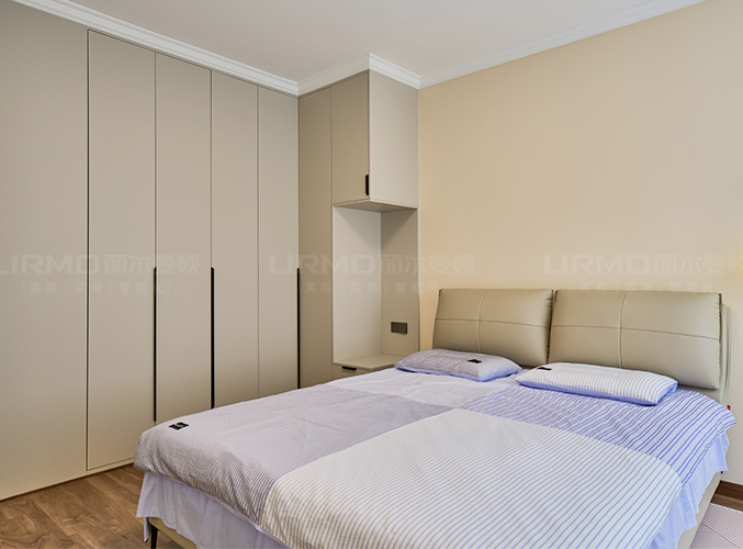 柜子一門到頂設(shè)計,實木柜體搭配PET膚感柜門,床邊搭配暖色系吊燈,