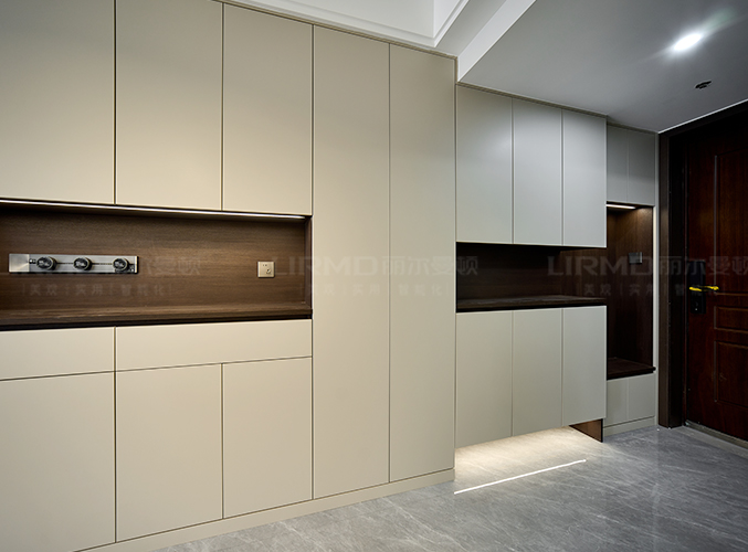 18mm厚杉木芯板,入戶鞋柜+餐邊柜的設(shè)計,大大提升了收納空間,鞋柜下方懸空設(shè)計,