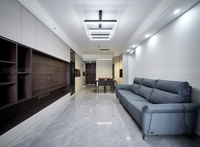 整屋通鋪瓷磚,盡顯大氣,電視背景墻采用整面墻設(shè)計,整體效果不顯沉悶,