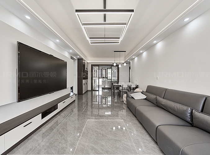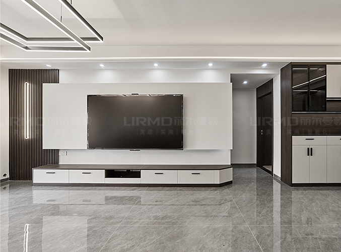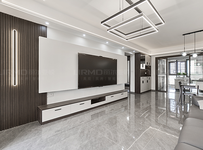 整屋通鋪瓷磚,盡顯大氣,整墻電視背景墻設計,下方搭配柜子,收納方便,吊燈設計,