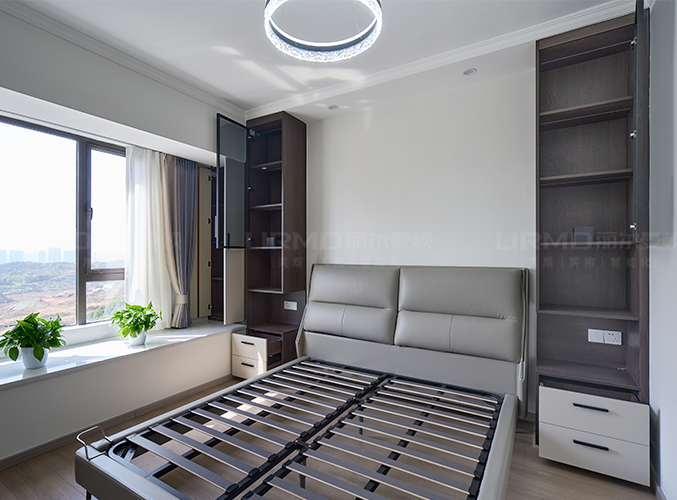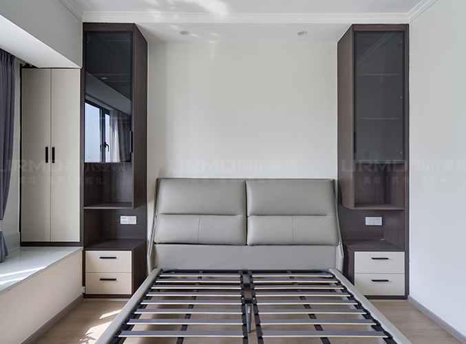主臥兩側定制床頭柜,柜體延伸至頂端,充分利用空間,側面做一個L型的衣帽間,