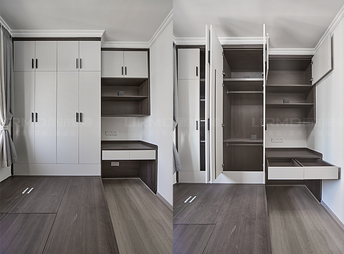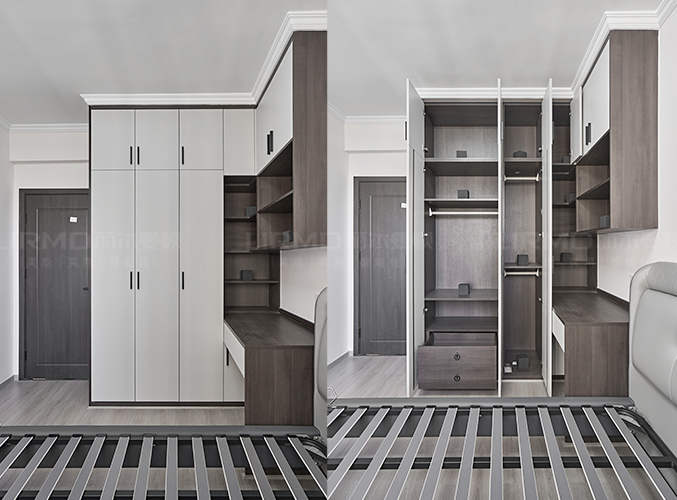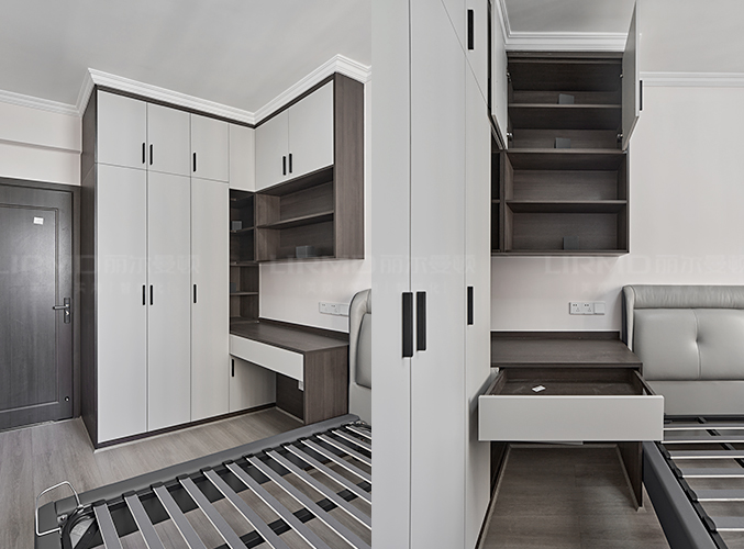 榻榻米即可做床,也可以做收納,衣柜、書桌、書架一體化組合,一柜三用既不占空間,