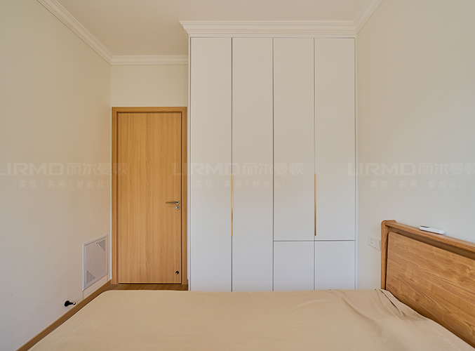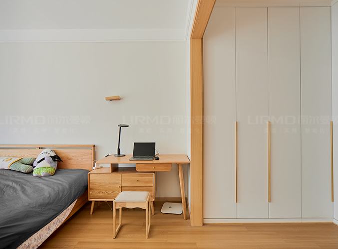 臥室整體原木+奶白,實(shí)木柜體搭配PET膚感柜門,一門到頂,質(zhì)感超不錯(cuò),