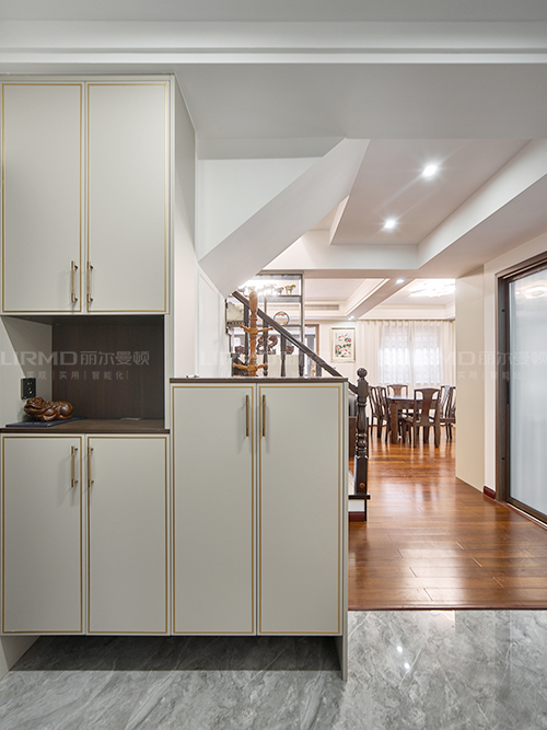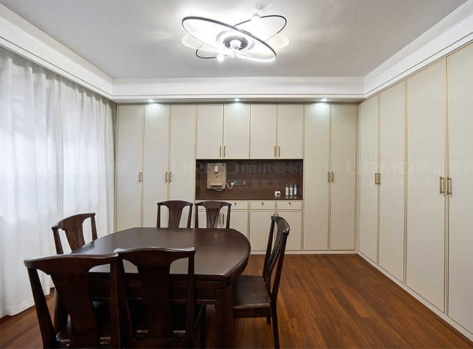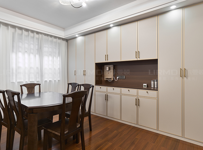 餐廳整墻做餐邊柜,白色柜門鑲嵌金屬邊框,分段造型柜門設計僅限優(yōu)雅檔次。