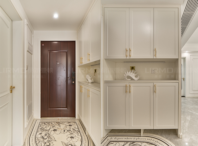 奶油色鞋柜搭配置物花紋腳墊,柜子中間內(nèi)嵌設(shè)計(jì),可以放置鑰匙包包等物品,