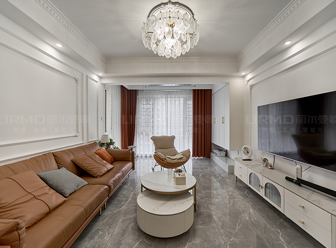 整屋通鋪瓷磚,盡顯大氣,整墻電視背景墻設(shè)計(jì),下方搭配柜子,收納方便,吊燈設(shè)計(jì),