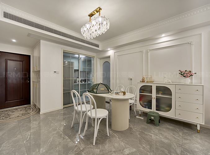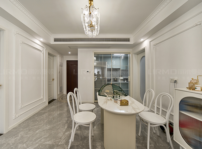 餐廳比鄰廚房,餐桌椅選奶白色及線條圓潤(rùn)柔和的造型,與周圍法式風(fēng)格相呼應(yīng)。