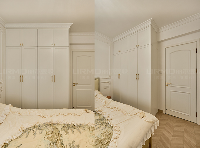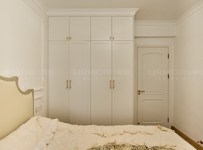 臥室延續(xù)客廳風(fēng)格以奶油色為基調(diào),靠墻做整衣柜,實(shí)木柜體搭配PET膚感柜門,