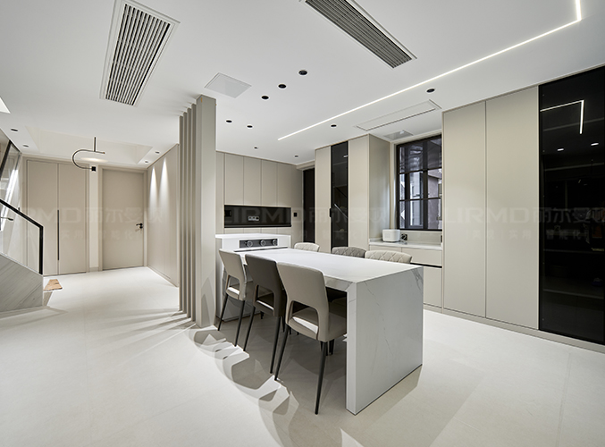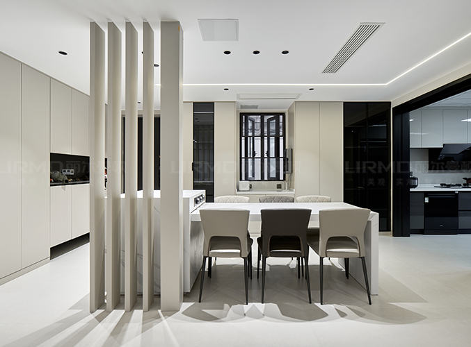 餐廳整墻做餐邊柜,島臺餐桌一體,可推拉調節(jié)餐桌長度,滿足多人聚餐需求。