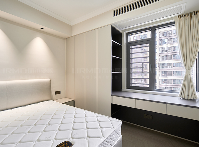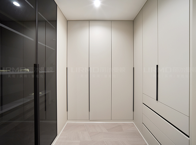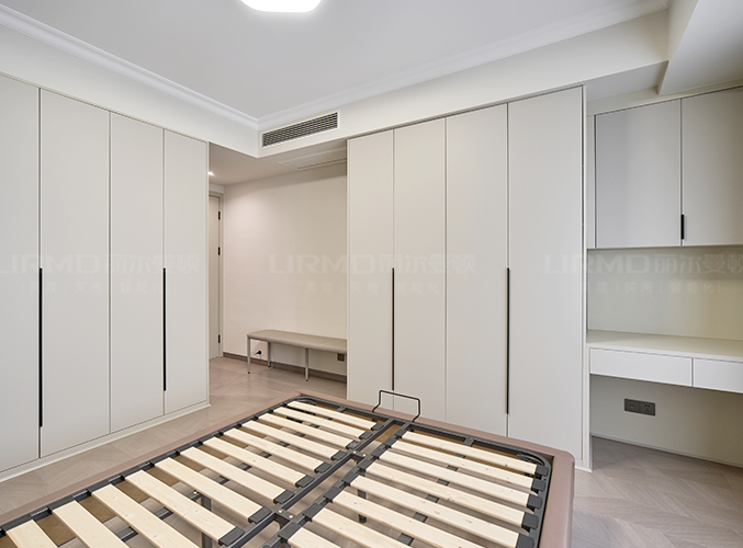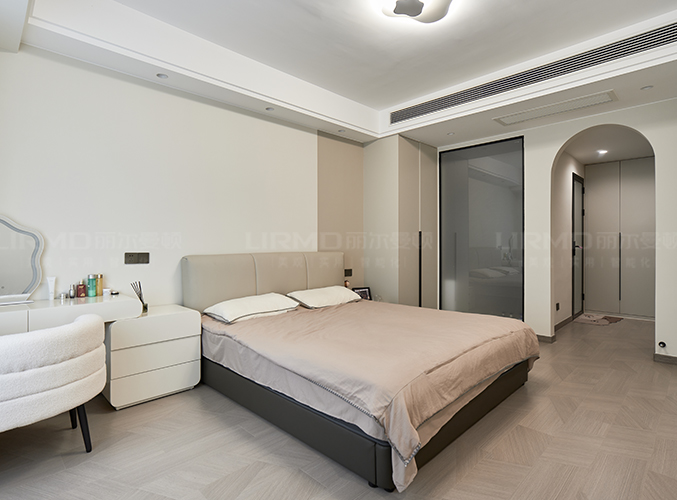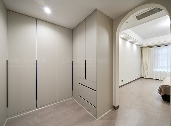 臥室拱形門分割衣帽間,滿墻衣柜實現(xiàn)門墻柜一體化,整體統(tǒng)一高級。