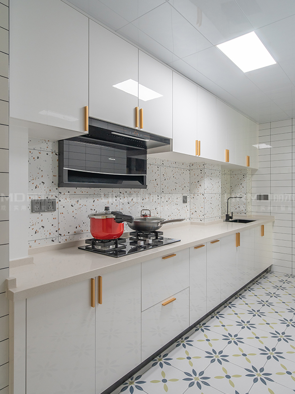 地面復(fù)古花磚的延伸感讓廚房看起來(lái)更大