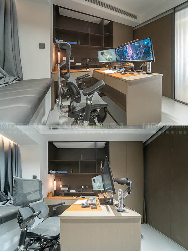 全房柜子是玻璃柜門與木制柜門相結(jié)合,既通透又顯高級(jí),搭配各種手辦設(shè)計(jì)感滿滿