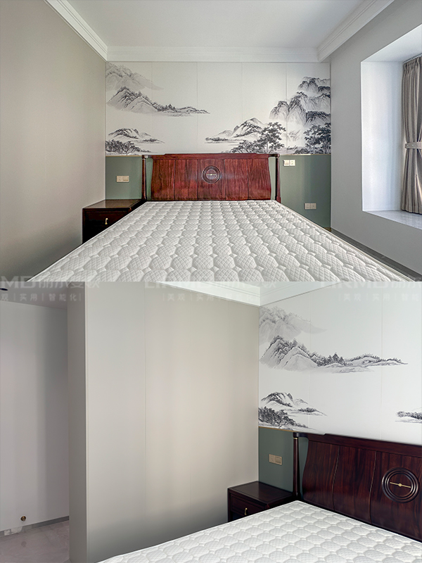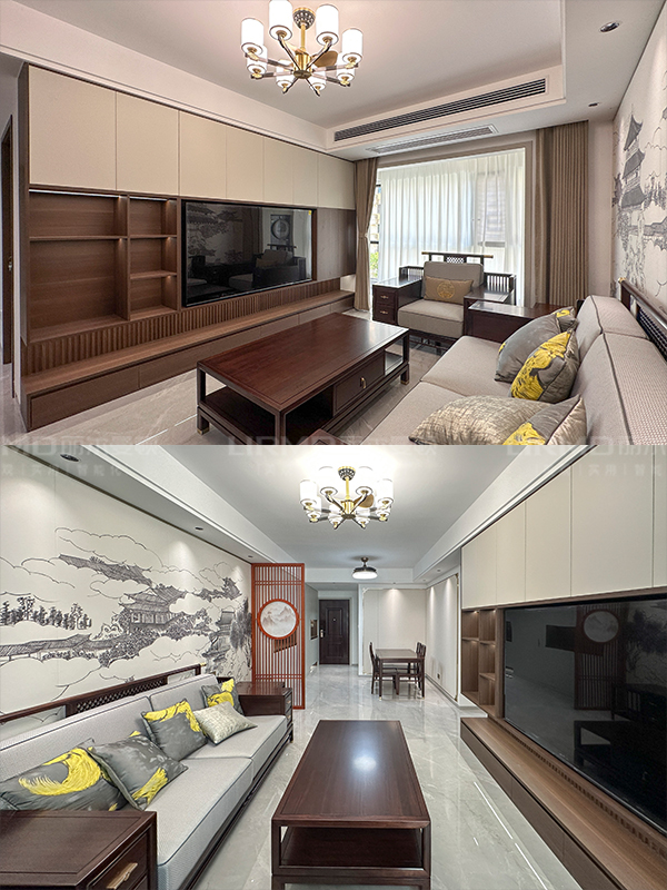 入戶柜與客廳用紅色屏風(fēng)隔斷,連接水墨畫背景,余韻十足