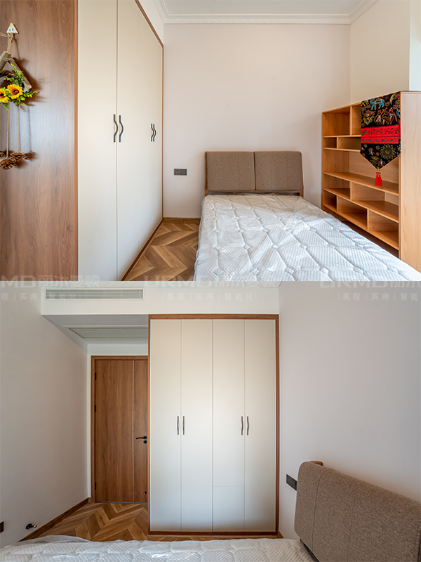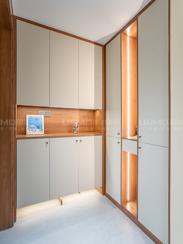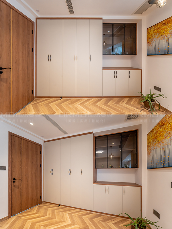 全屋定制:使用萬象天冠品牌18厚環(huán)保ENF級(jí)杉木芯板柜體、山東豐源仙檀山歐松板大薄片膚感柜門、