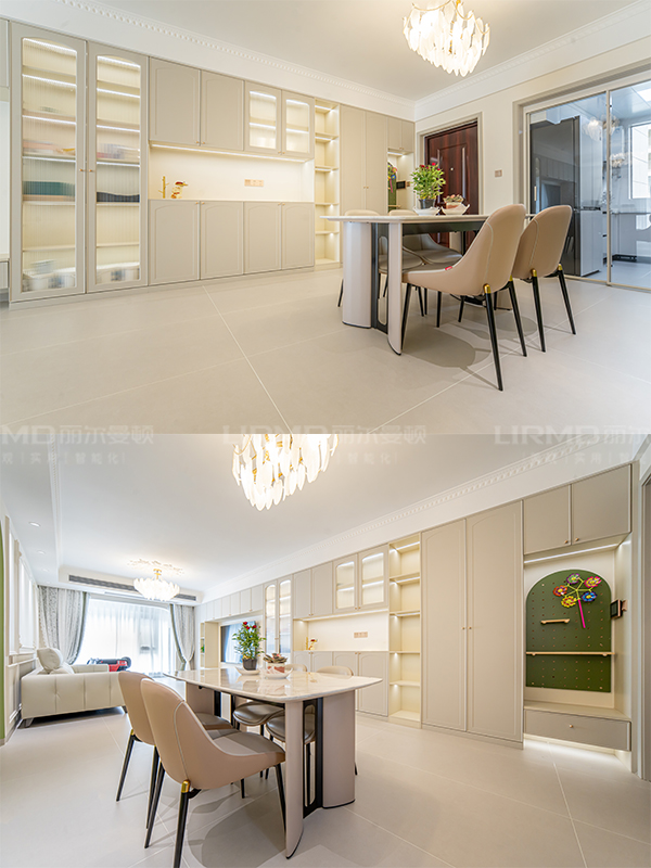客餐廳墻面采用pu線條及角花作為點(diǎn)綴,搭配牛油果綠,更顯優(yōu)雅復(fù)古