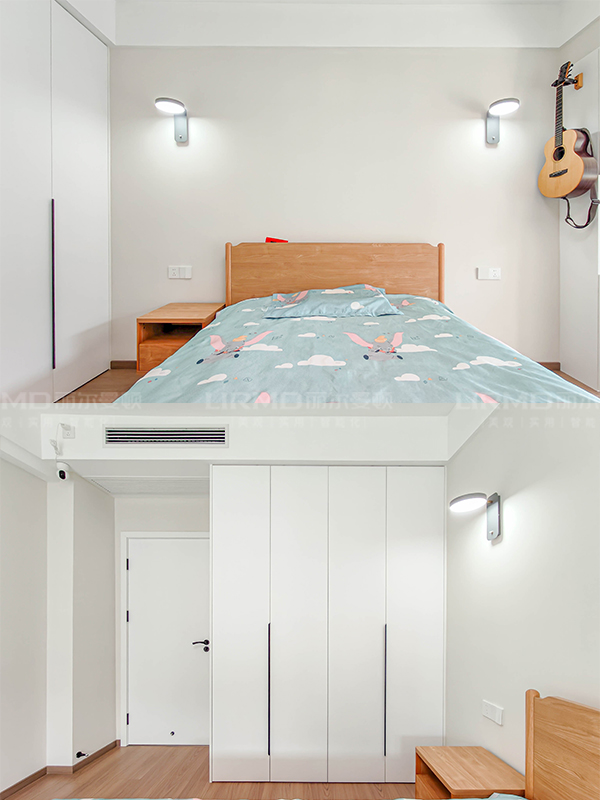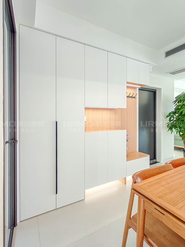 陽(yáng)臺(tái)收納柜、L型櫥柜、主臥衣柜、次臥衣柜、兒童房衣柜、書(shū)房書(shū)柜、書(shū)房書(shū)桌、兩個(gè)定制浴室柜,以及同色到頂房門)