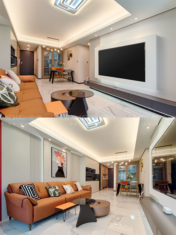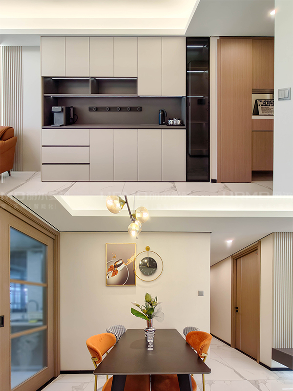 餐廳和客廳沙發(fā)背景墻都結合墻板+木格柵的撞色設計,時尚又高級!