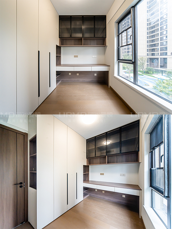 書房采用書桌衣柜一體化設(shè)計(jì),搭配玻璃柜門,更有層次感