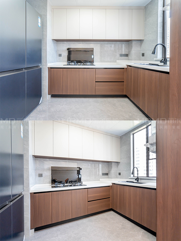 高端全屋定制:柜體板材為十環(huán)認證的萬象天冠18mm厚杉木芯板、柜門是歐松板雙飾面門、奧地利進口百隆五金。