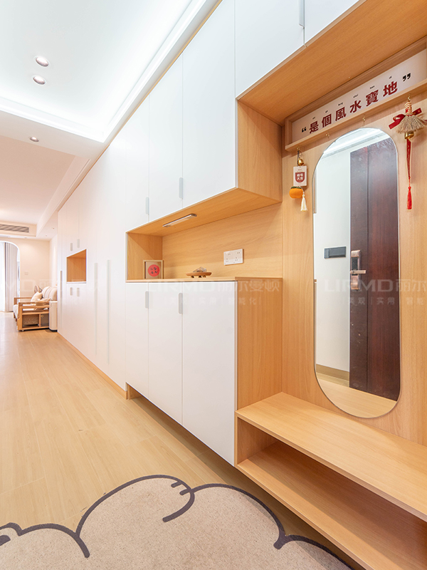 入戶衣帽間設計了換鞋凳、掛衣區(qū)、入戶鞋柜,并與餐邊柜做一體式設計,簡潔又大氣??