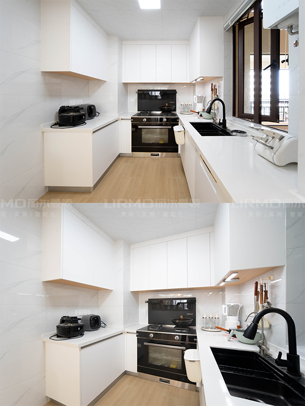 高端全屋定制:柜體板材為十環(huán)認證的萬象天冠18mm厚杉木芯板、柜門是歐松板雙飾面門、奧地利進口百隆五金。