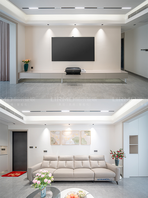 客廳做無(wú)主燈和雙眼皮吊頂設(shè)計(jì),整體更顯開(kāi)闊