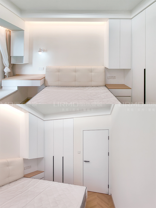 臥室一側(cè)從飄窗延伸打造床頭柜,床頭柜與背景墻材質(zhì)一致視覺(jué)上看起來(lái)簡(jiǎn)單又舒適
