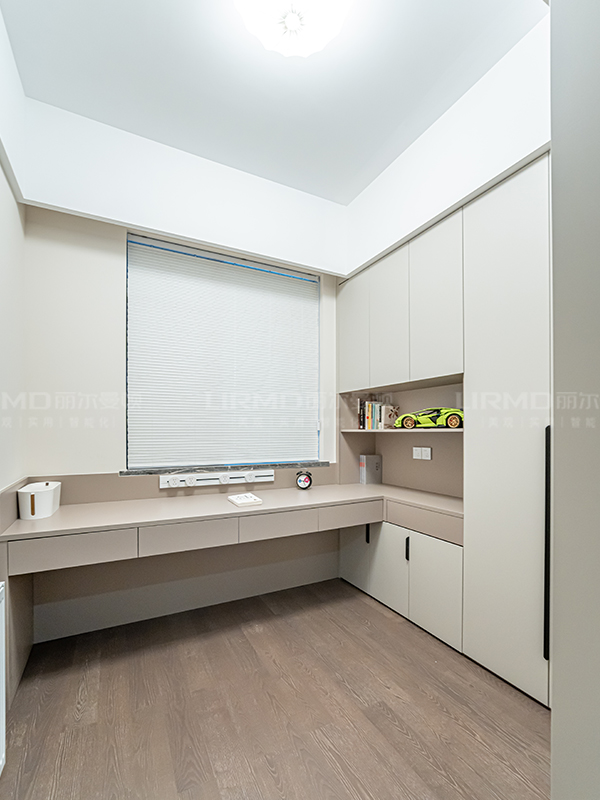 書柜轉(zhuǎn)角書桌一體式設(shè)計(jì),視覺上形成 L 型布局,增加空間連貫性。