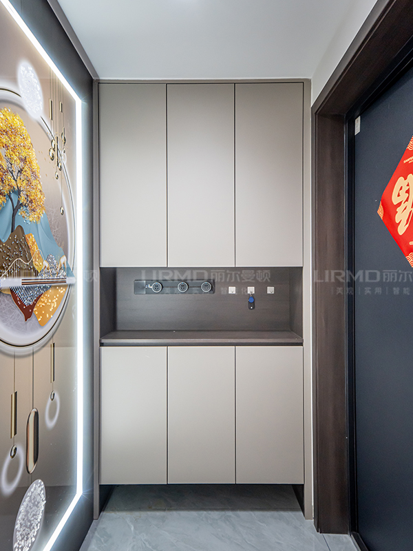 炫光裝飾畫搭配燈帶,氛圍感拉滿,右邊就是玄關(guān)鞋柜,便捷方便