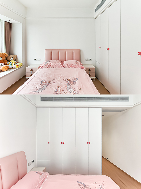 空間充分利用了起來,收納功能強(qiáng)大。木色柜門無把手設(shè)計(jì),視覺上感覺很干凈清爽