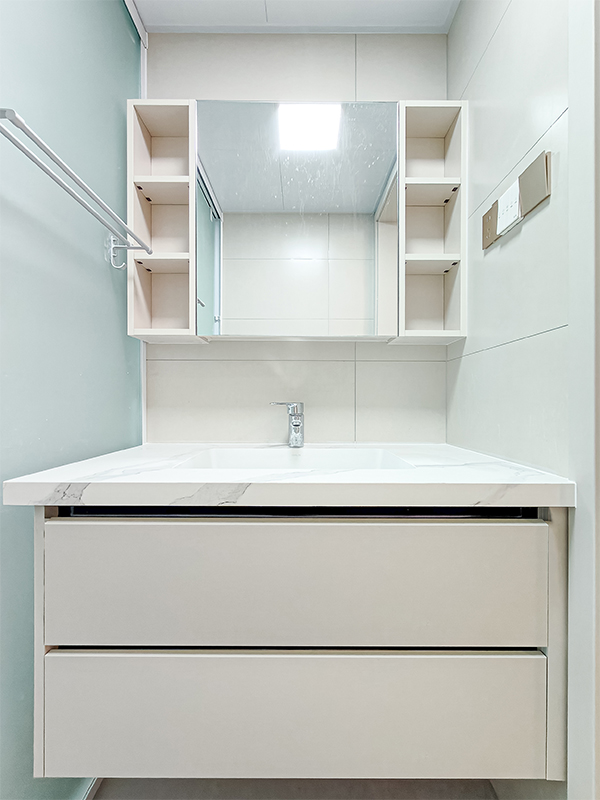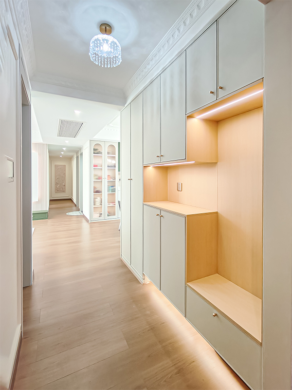 全房用大面積的淺奶油灰色,但在質(zhì)感上做出凹凸門格柵板等不同的表現(xiàn)形式,細(xì)節(jié)處處體現(xiàn)質(zhì)感