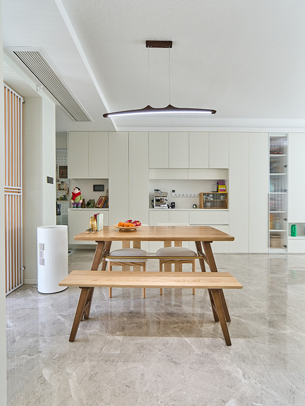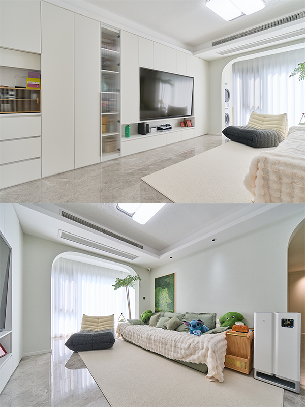 滿墻電視柜用開(kāi)放格和玻璃門做點(diǎn)綴,讓整個(gè)空間高級(jí)又細(xì)膩