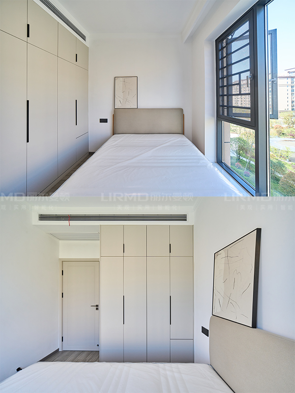 次臥書桌和衣柜一體化設(shè)計,既滿足了床頭收納的需求,又增加了收納空間