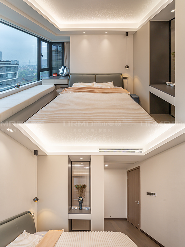 中間做玻璃隔斷增加衣帽間的透光性,玻璃柜門與吊柜結合讓空間利用最大化