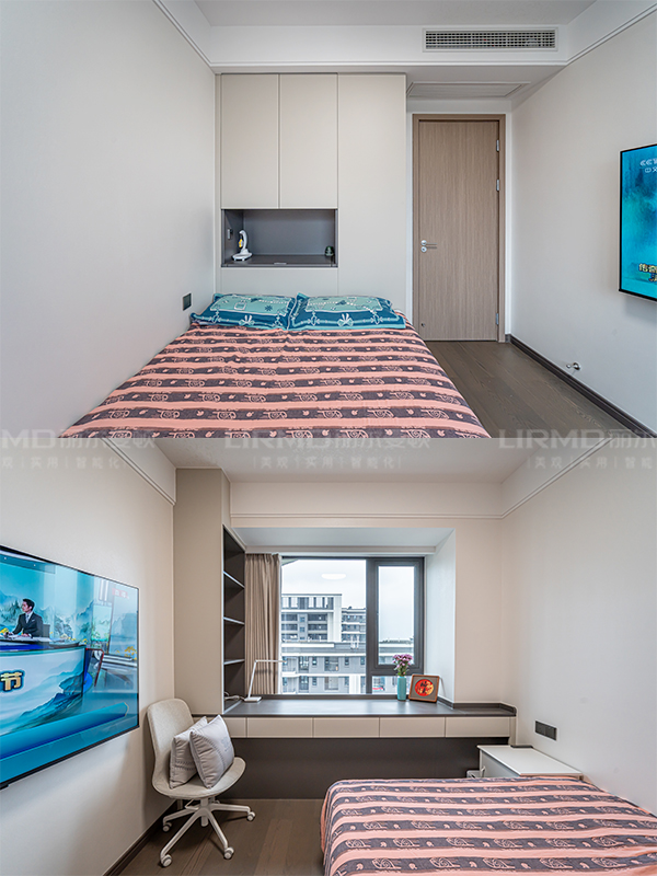 用收納柜內嵌電視機,避免突兀感,平整大氣,旁邊開放格收納,兼具裝飾性
